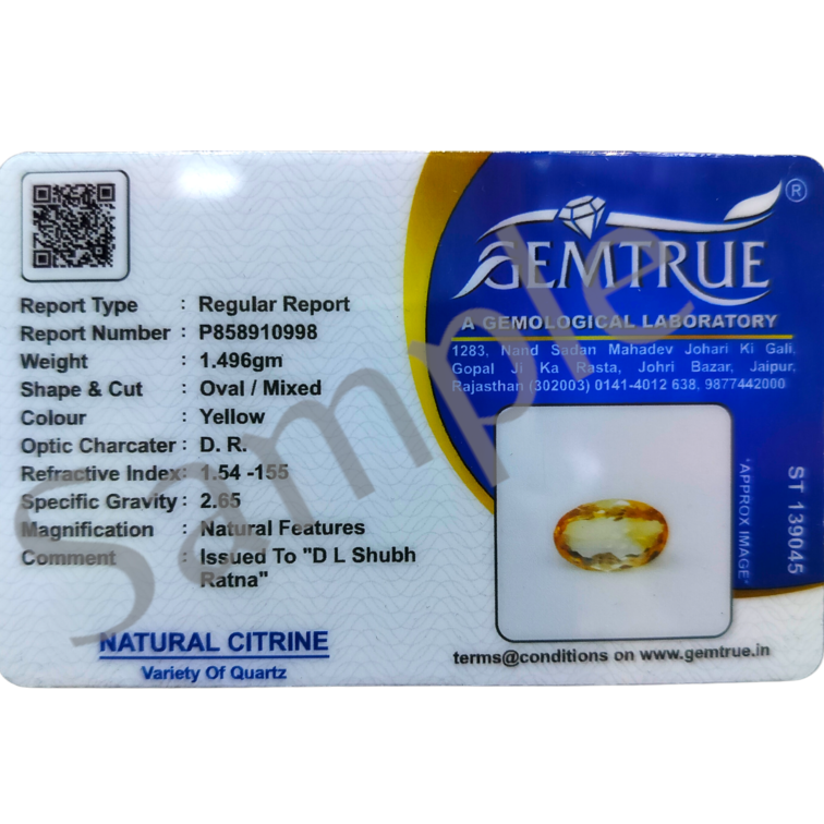 Citrine (Sunela) is a natural, yellowish semi-precious gemstone from the Quartz mineral family. According to the Vedic astrology, this gemstone is worn as the substitute (upratna) of precious Yellow Sapphire to gain wealth, good social status, higher knowledge, health and progeny bliss.